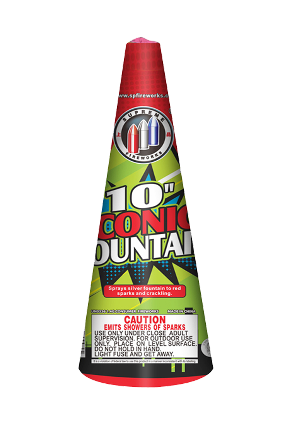 10" Conic Fountain- A classic tall cone that shoots brilliant gold and silver sparks high into the sky with a bright, crackling finish. Perfect for any celebration.