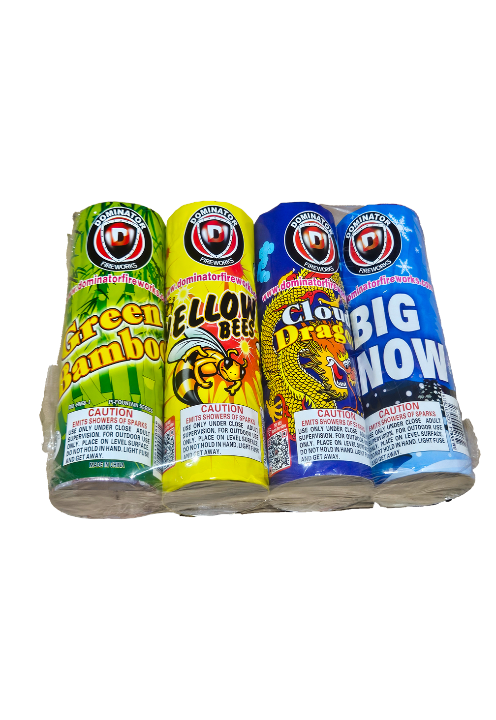Floral Fountain Assortment (Green Bamboo, Yellow Bees, Cloud Dragon & Big Snow) – A vibrant mix of colorful flower pots that light up the night with dazzling sparks and effects. Each fountain brings its own unique burst — from golden showers to shimmering colors — making it perfect for backyard Diwali celebrations or family gatherings.